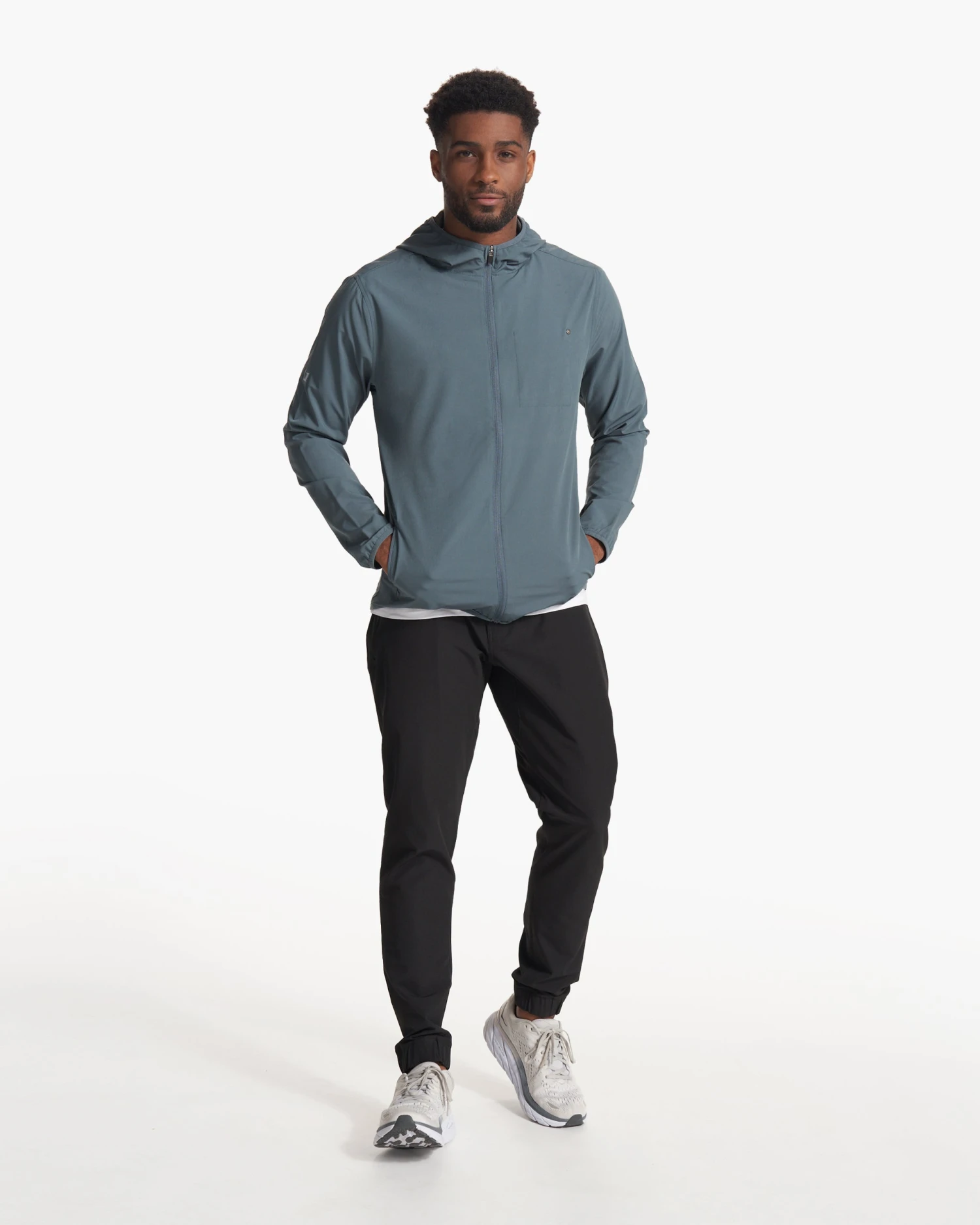 Take on the great outdoors in our men’s hooded Outdoor Trainer Shell jacket. The four-way stretch lightweight performance material is water resistant and moisture wicking. Plus, multiple zip pockets and a reflective logo so you’re covered on all your outside adventures.